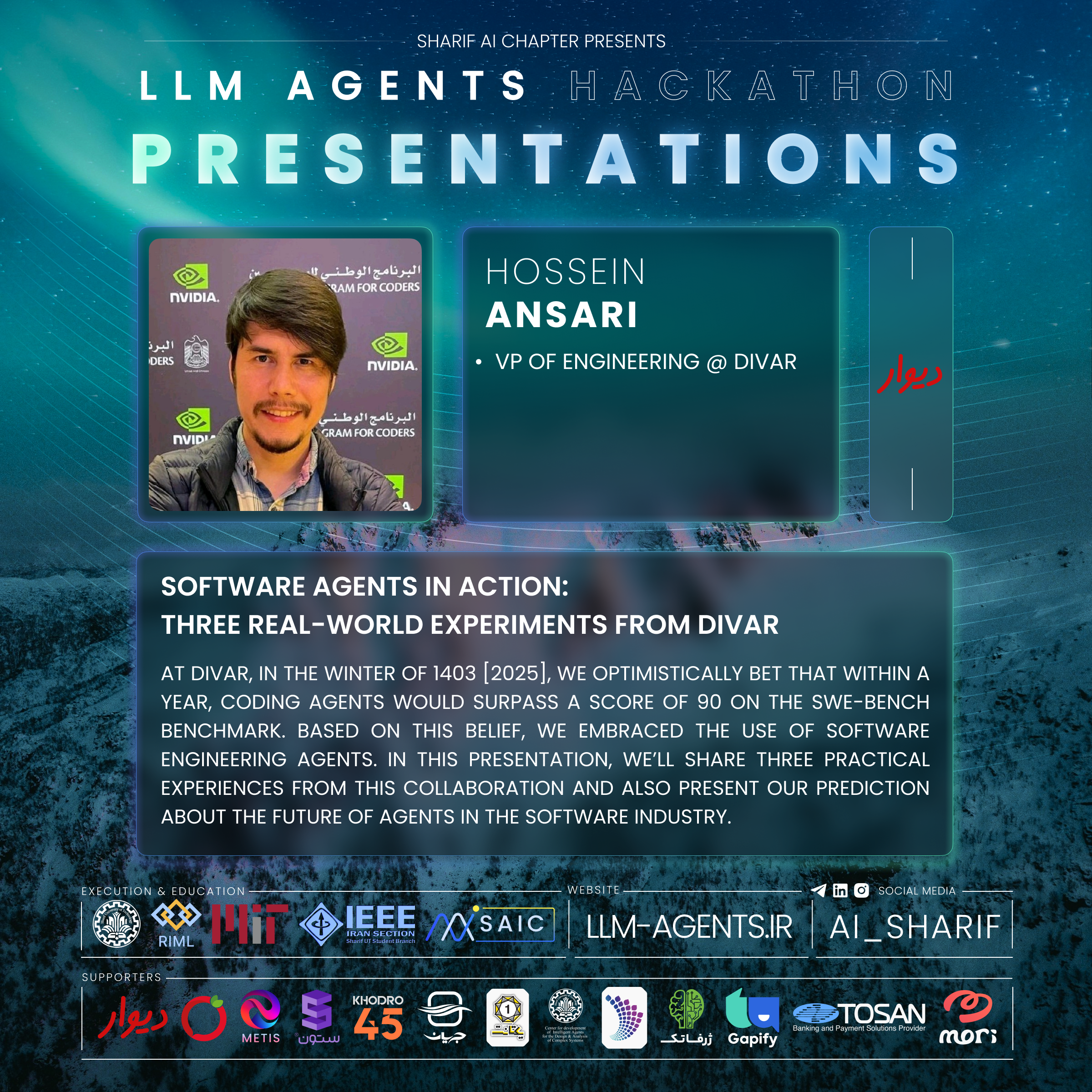 At Divar, in the winter of 1403 [2025], we optimistically bet that within a year, coding agents would surpass a score of 90 on the SWE-bench benchmark. Based on this belief, we embraced the use of software engineering agents. In this presentation, we’ll share three practical experiences from this collaboration and also present our prediction about the future of agents in the software industry.