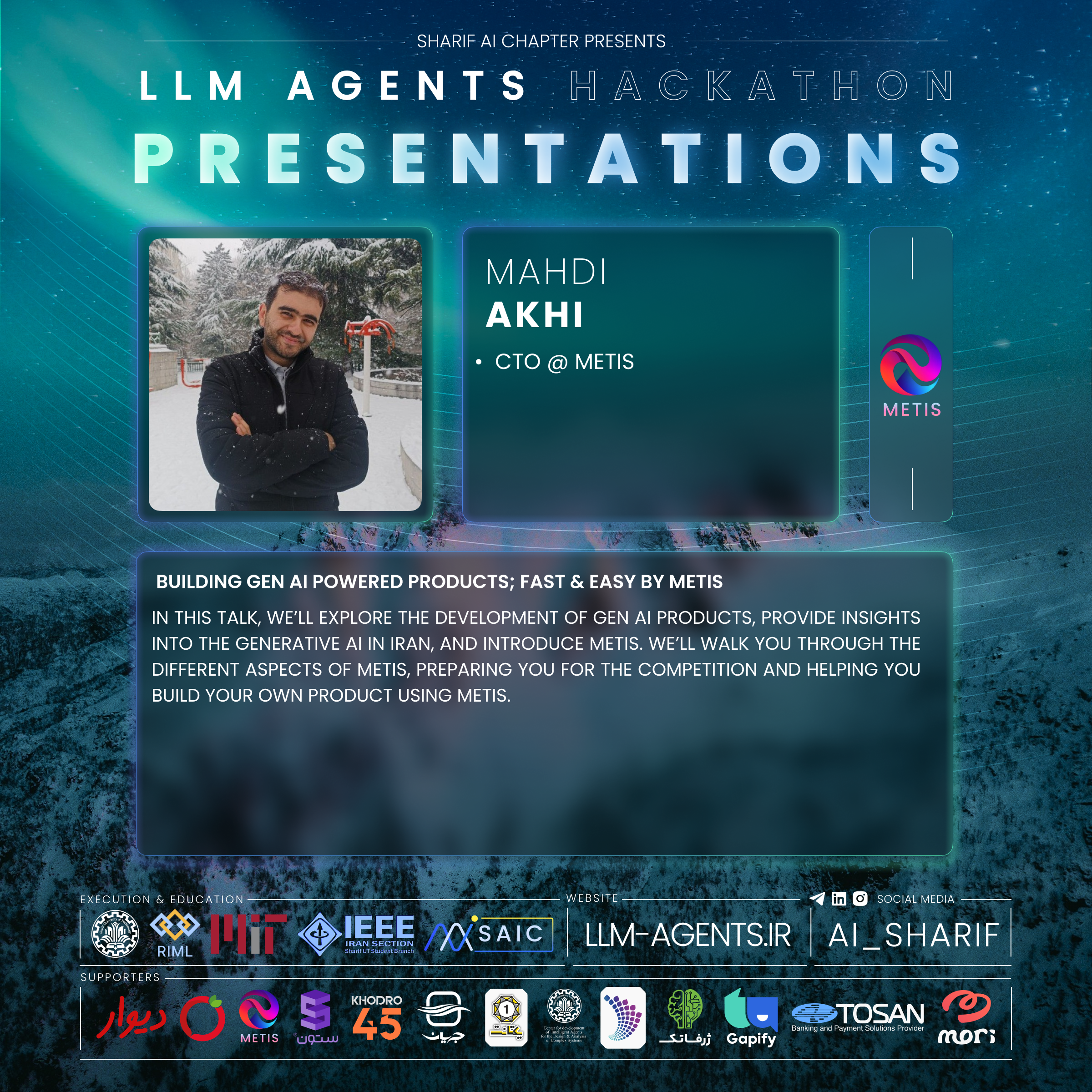 In this talk, we’ll explore the development of Gen AI products, provide insights into the Generative AI in Iran, and introduce Metis. We’ll walk you through the different aspects of Metis, preparing you for the competition and helping you build your own product using Metis.